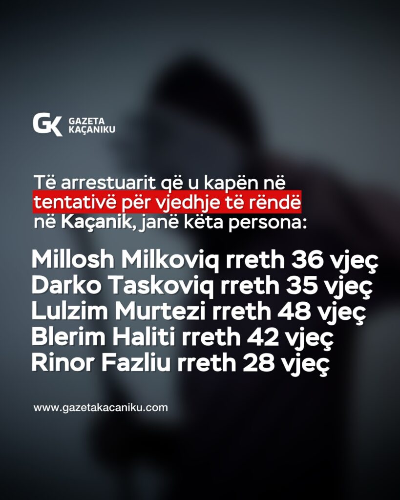 Ngjarja ka ndodhur më 01 shkurt 2026, rreth orës 01:40, në rrugën “Ismail Raka”, pranë artarisë “Fera”, ku dy shtetas të Serbisë janë kapur në flagrancë duke tentuar të thyenin dritaren e lokalit. Ndërkohë, në një veturë me targa vendore janë ndaluar edhe tre persona të tjerë nga Podujeva, të dyshuar si pjesë e të njëjtit grup.